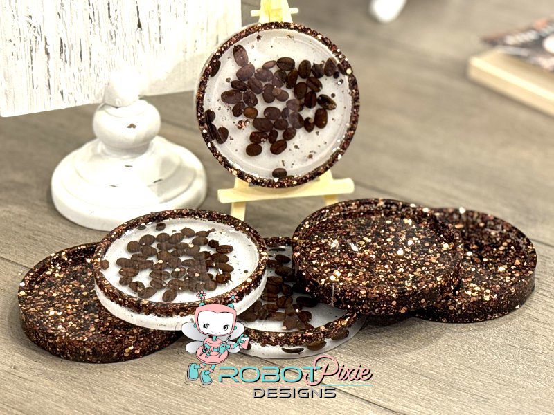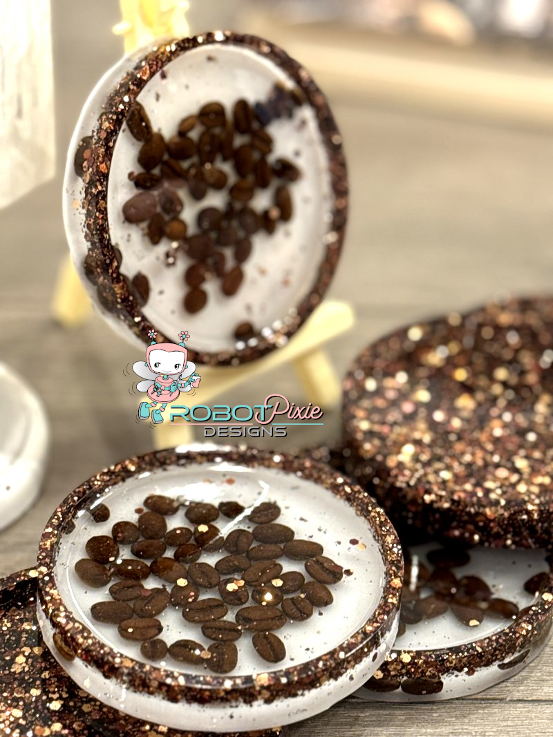 Coffee lovers rejoice! Here's a coaster set just for you! Made with REAL coffee beans, this set has 6 coasters with slightly raised rims - 3 with the beans and 3 with matching java glitter.