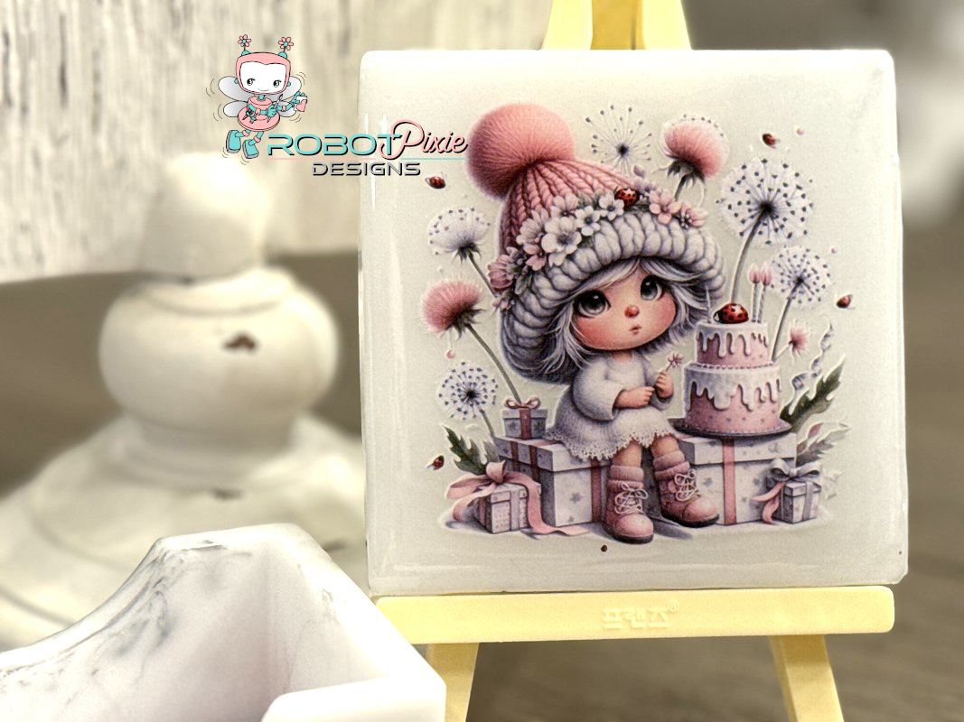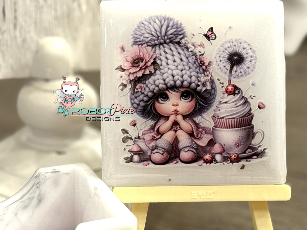 This gorgeous set of coasters features 4 different images of an adorable little girl with a fuzzy hat, dandelions, and delicious pink treats. The images are set on top of a swirly pearl white background. This is a bundle of four coasters, along with a coordinating coaster holder swirled with a gorgeous pink and white marble look, sold as exact items in photos. Each coaster comes with a cork underside. Every item is hand poured, and features its own distinct swirls and patterns, ensuring no two sets are alike.
